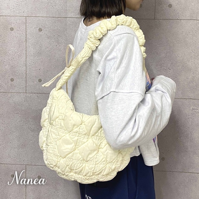 手持ち、肩掛けトート、斜め掛けショルダーと用途で使い分けできる万能バッグ。ポコポコとしたポップコーンを連想させるキルティングの表面感がとにかく可愛い!肩紐にはシャーリングストリングを内蔵しており、ギュッと絞ればトレンドのギャザーハンドルに早変わり♪長さの調節も容易です◎ワンハンドルのバッグは、サッと肩に掛けたり、斜め掛けにできたりと、体のラインにも馴染みやすい形状です。普段使いはもちろん、ペタンコになるので旅行のお供に持っていき旅先でのお出掛けにも使い易いバッグです。三日月型のフォルムも可愛いポイント♪ファスナー仕様のメイン口なので荷物が外に飛び出さない安心設計。サッと取り出したい物を収納できるアウトポケットやファスナー付きのインナーポケット付きなので、小物の整理も◎定番のアイボリー、ブラックの2色展開です。 ☆バッグ 【素材・成分】 ポリエステル100% 【生産地】 中国