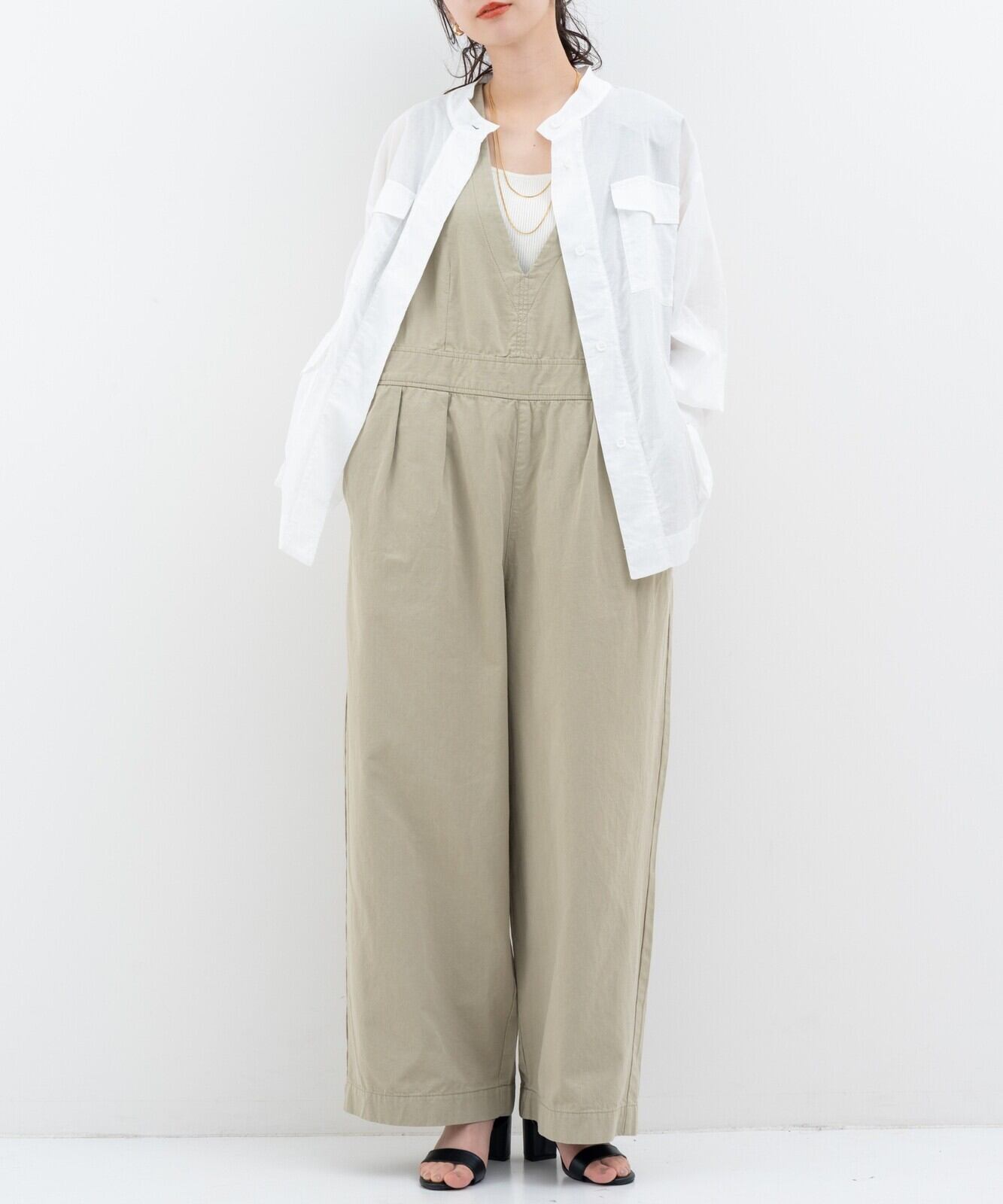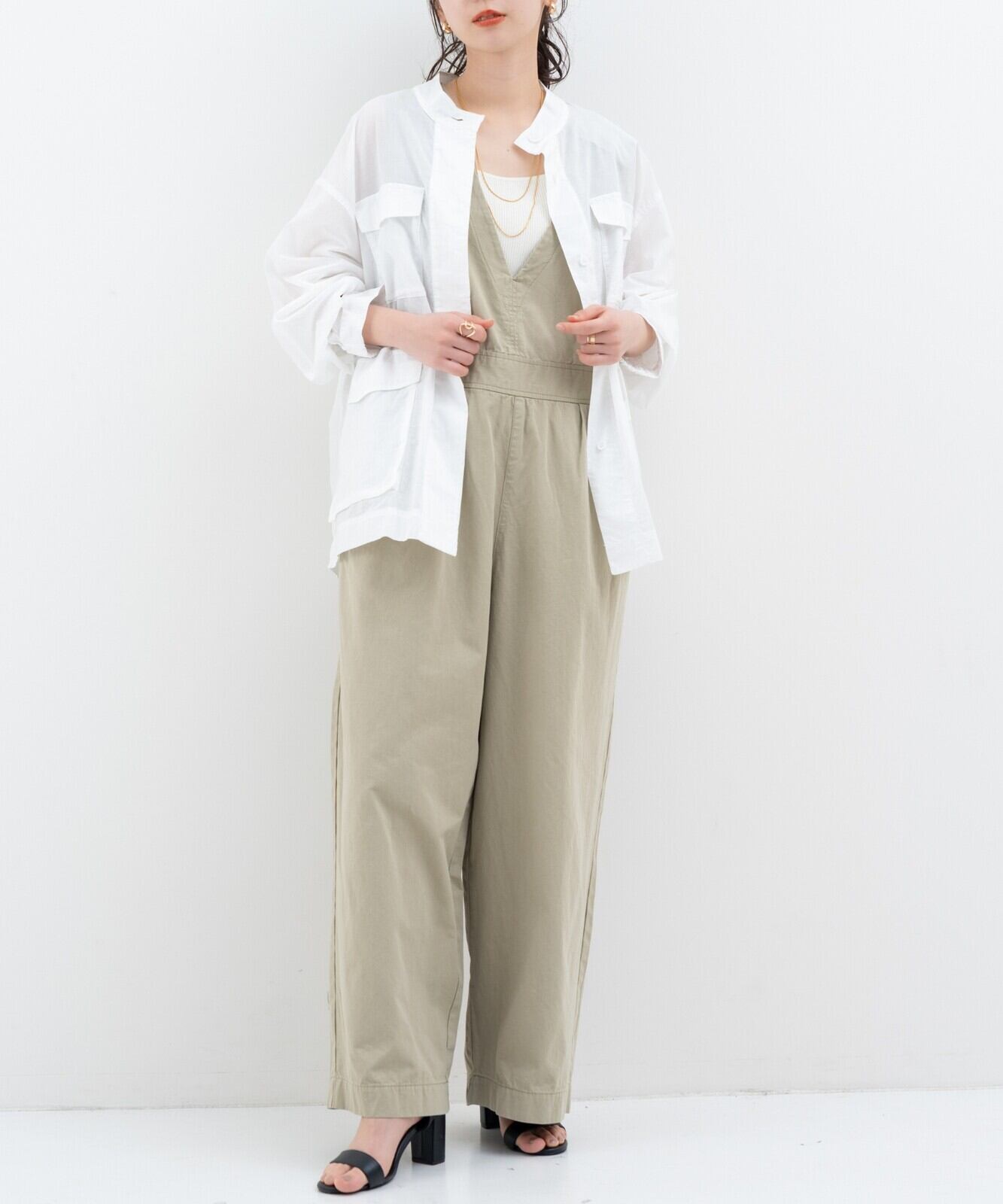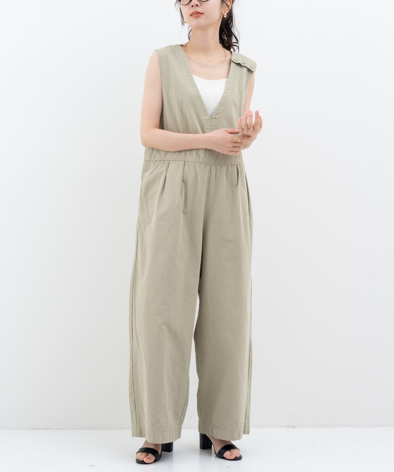 綿素材のサロペットパンツ!左肩部分に3個のスナップボタンで、着脱ができる仕様にしています。深いVネックデザインなのでお顔周りをすっきりと見せてくれます。シアー感のあるインナーと合わせれば大人カジュアルなスタイリングに◎真夏にはインあーをタンクトップにしていただければ、涼しく快適に過ごせそうです♪