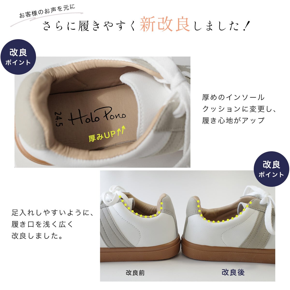 履き口を浅くして足入れしやすく、インソールの厚みをアップ!さらに履きやすくリニューアルしました!