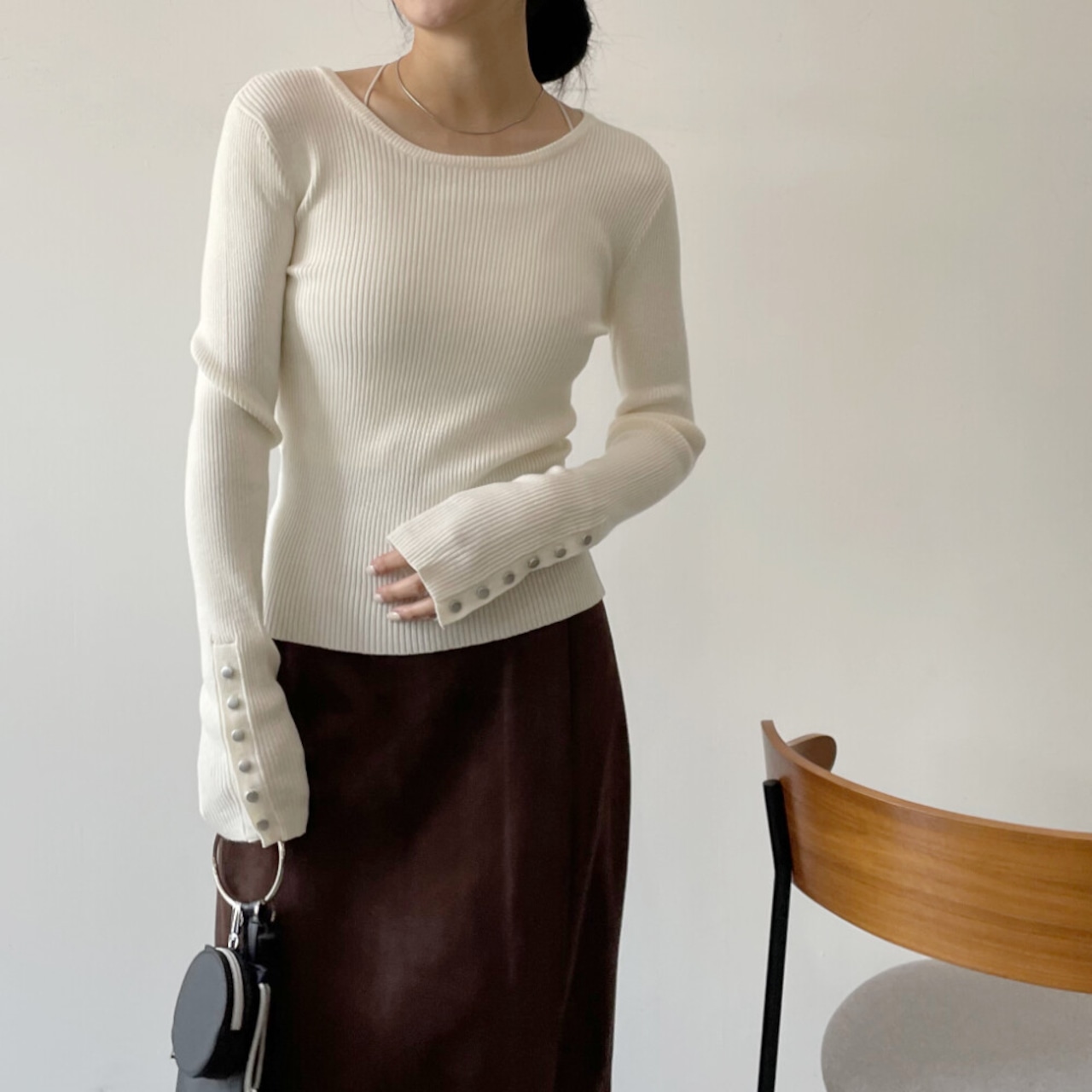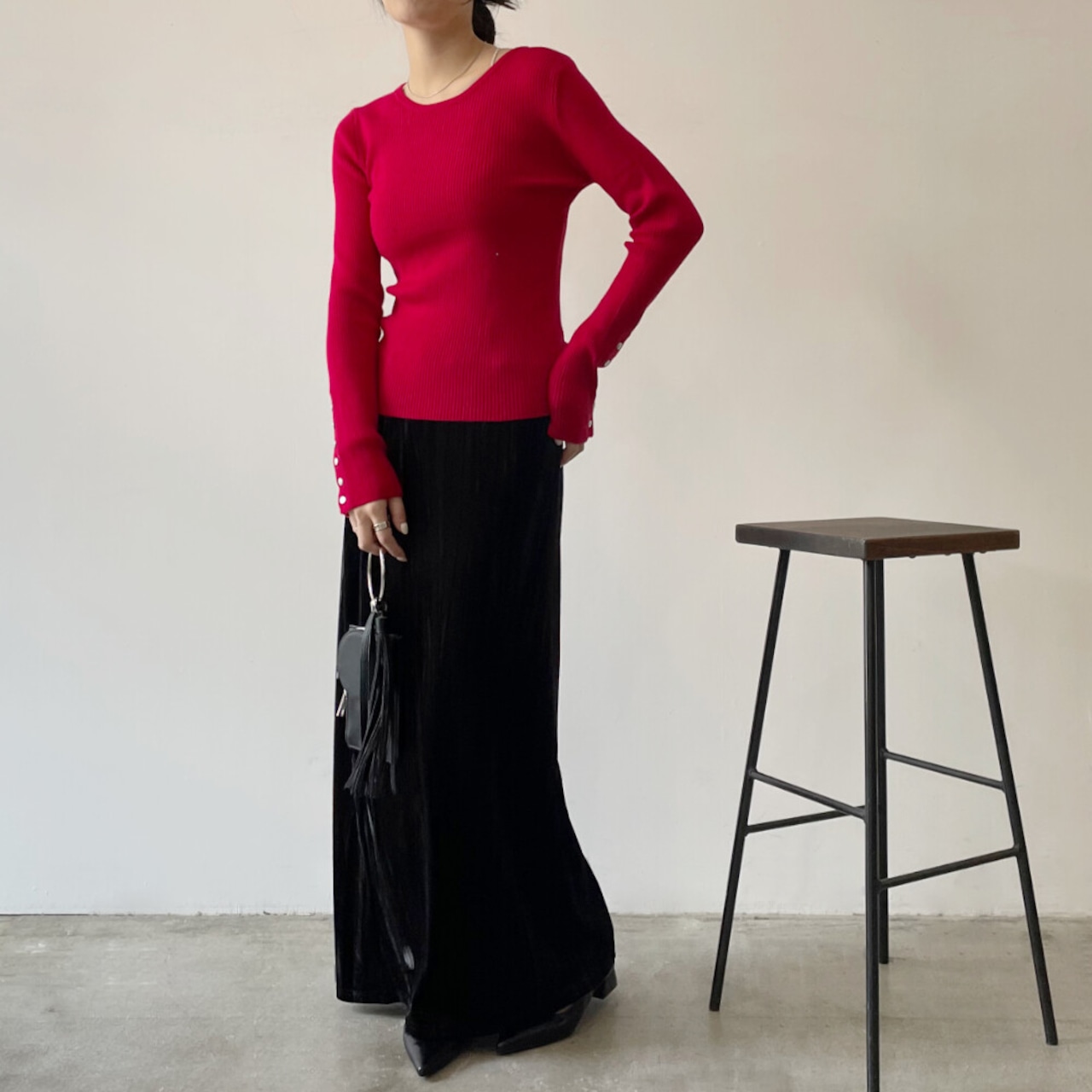 【design point】・もっちりとした肌触りのニット素材を使用・シンプルなデザインながら袖部分の釦がアクセントに! ボタンを調整してお好みのスタイリングをお楽しみいただけます◎・すっきりとしたシルエットでレイヤードしやすくこなれ感もだしてくれます◎