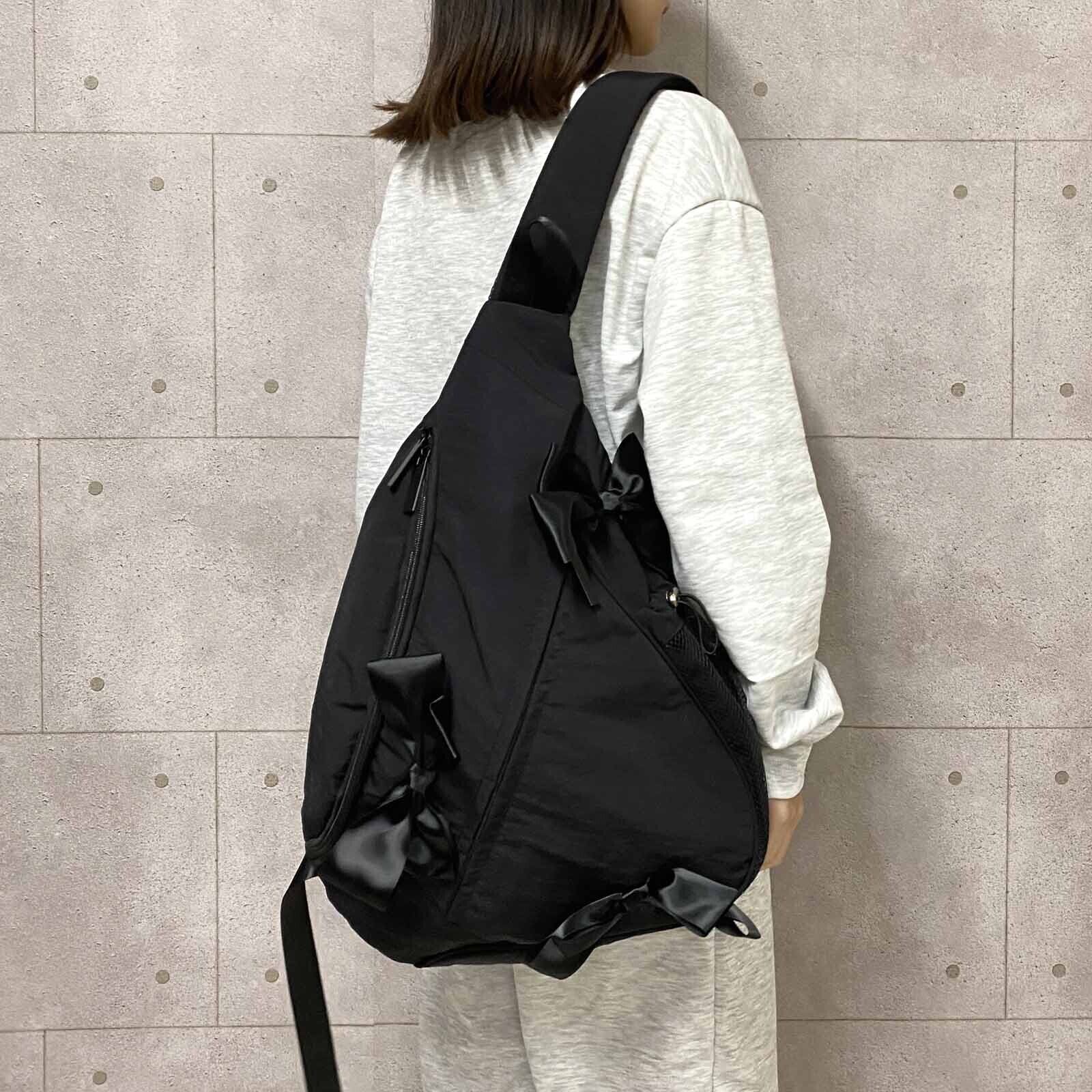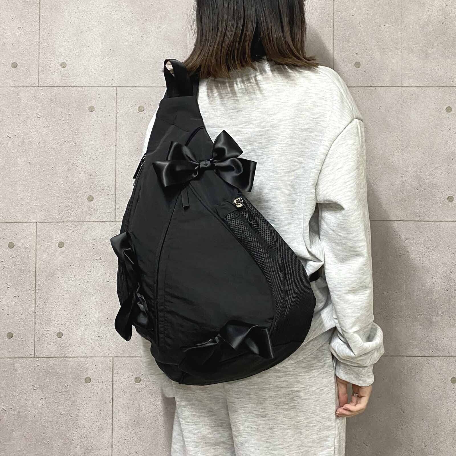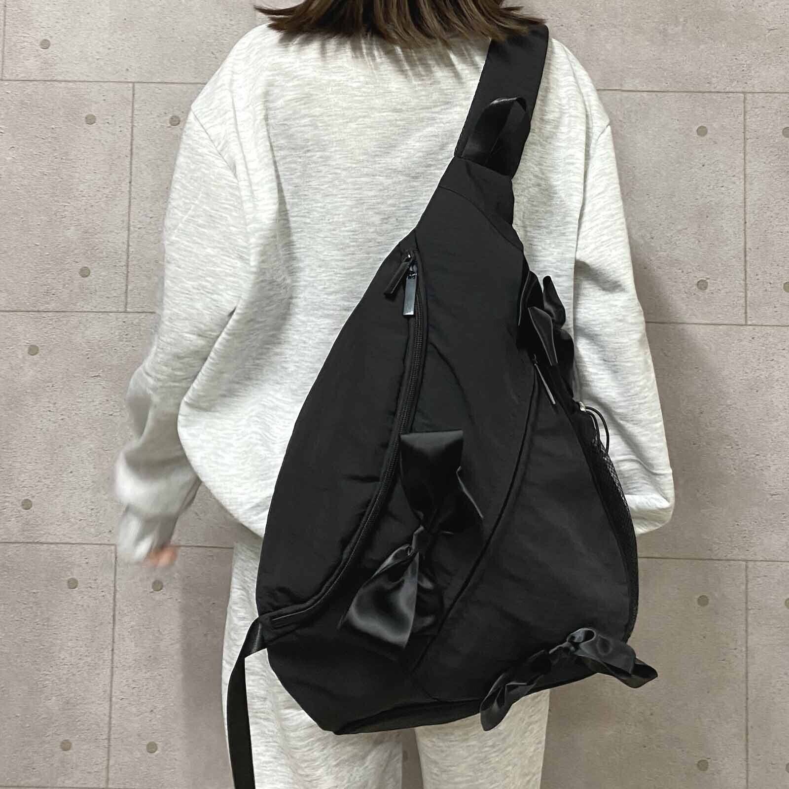 ※グレー完売です(1/13更新)大き目のリボンをあしらった、大容量のスリングバッグ。フロント部分のリボンは、アクセサリーのようにスタイリングのポイントになります!バックパックとは違った、新鮮な雰囲気をコーディネートにプラスできるバッグです。見た目以上に収納力があり、荷物が多い日でも安心のサイズ感です。一般的なノートパソコンのサイズならズボッと入ります。メイン収納以外にもポケットやサイドにメッシュポケットもついていて、機能面も◎背面にはクッションが入っているから、長時間背負っても疲れにくく快適な使い心地です。いつものスタイリングにさっと背負ってお出かけや学生さんの通学用バッグとしてもオススメ。ショルダーベルトがズレないよう固定できるストラップも付いているので、自転車に乗るときも安心です◎ちょっとスポーティーな雰囲気もあるので、トレンドのスポーツMIXスタイルが簡単に取り入れられます。リボンのデザインのディティールが可愛さを際立たせるアイテムなので、セットアップなどの統一感あるコーデに一味プラスしてみたり、Tシャツにデニム、スウェットパンツなどのデイリーカジュアルのアクセントとしても◎人とは違うバックをお探しの方にオススメです!旬なスポーツ×ガーリーが叶うアイテムです。クールなグレーと万能なブラックの2色展開です。