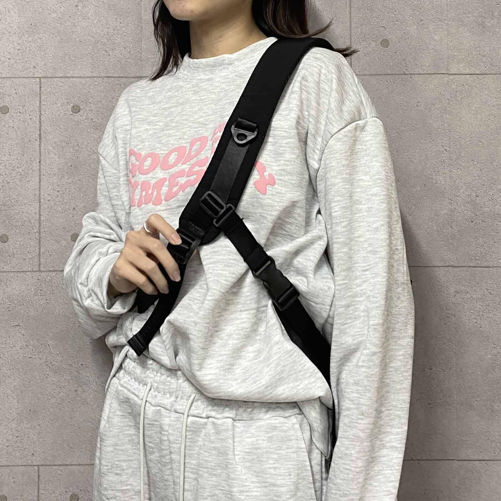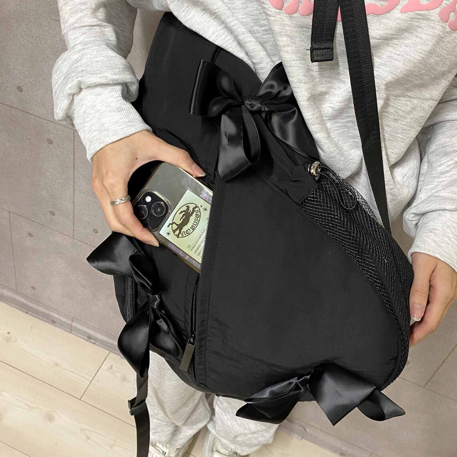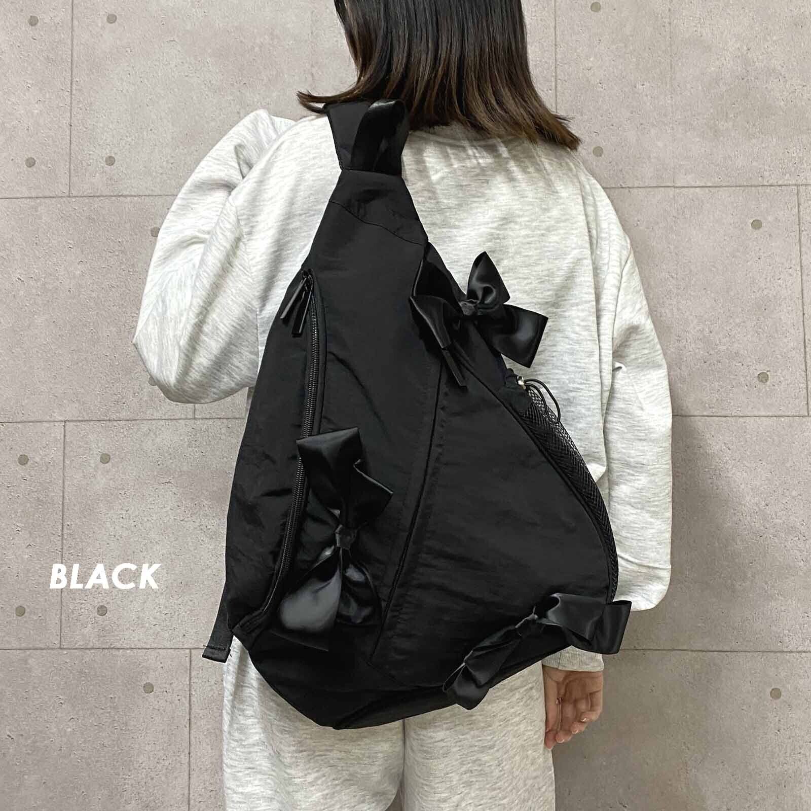※グレー完売です(1/13更新)大き目のリボンをあしらった、大容量のスリングバッグ。フロント部分のリボンは、アクセサリーのようにスタイリングのポイントになります!バックパックとは違った、新鮮な雰囲気をコーディネートにプラスできるバッグです。見た目以上に収納力があり、荷物が多い日でも安心のサイズ感です。一般的なノートパソコンのサイズならズボッと入ります。メイン収納以外にもポケットやサイドにメッシュポケットもついていて、機能面も◎背面にはクッションが入っているから、長時間背負っても疲れにくく快適な使い心地です。いつものスタイリングにさっと背負ってお出かけや学生さんの通学用バッグとしてもオススメ。ショルダーベルトがズレないよう固定できるストラップも付いているので、自転車に乗るときも安心です◎ちょっとスポーティーな雰囲気もあるので、トレンドのスポーツMIXスタイルが簡単に取り入れられます。リボンのデザインのディティールが可愛さを際立たせるアイテムなので、セットアップなどの統一感あるコーデに一味プラスしてみたり、Tシャツにデニム、スウェットパンツなどのデイリーカジュアルのアクセントとしても◎人とは違うバックをお探しの方にオススメです!旬なスポーツ×ガーリーが叶うアイテムです。クールなグレーと万能なブラックの2色展開です。