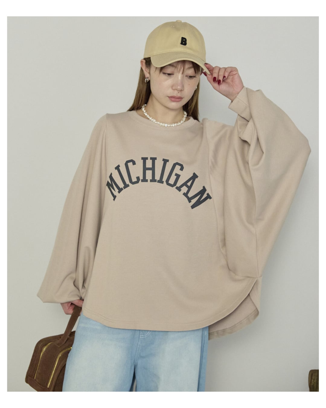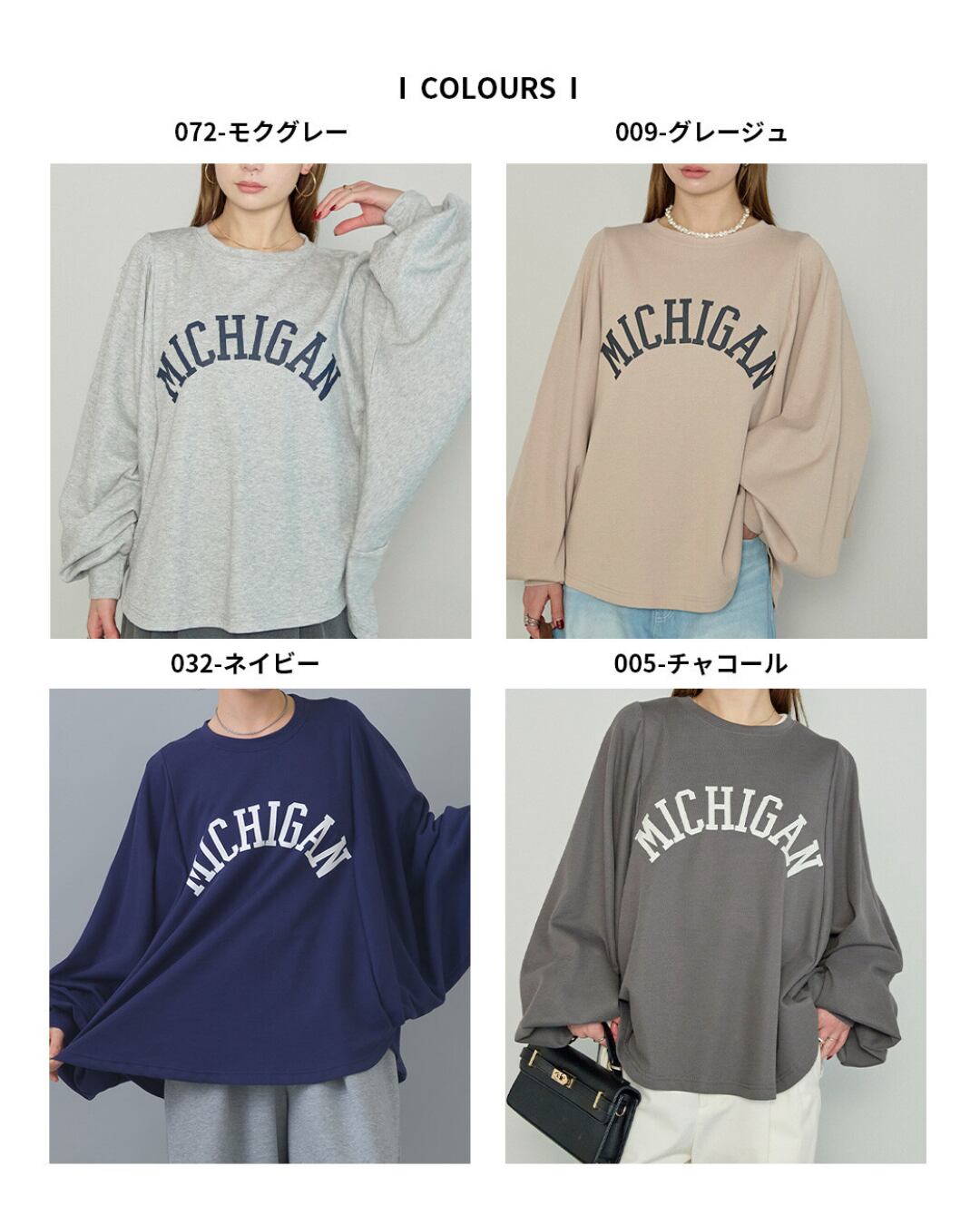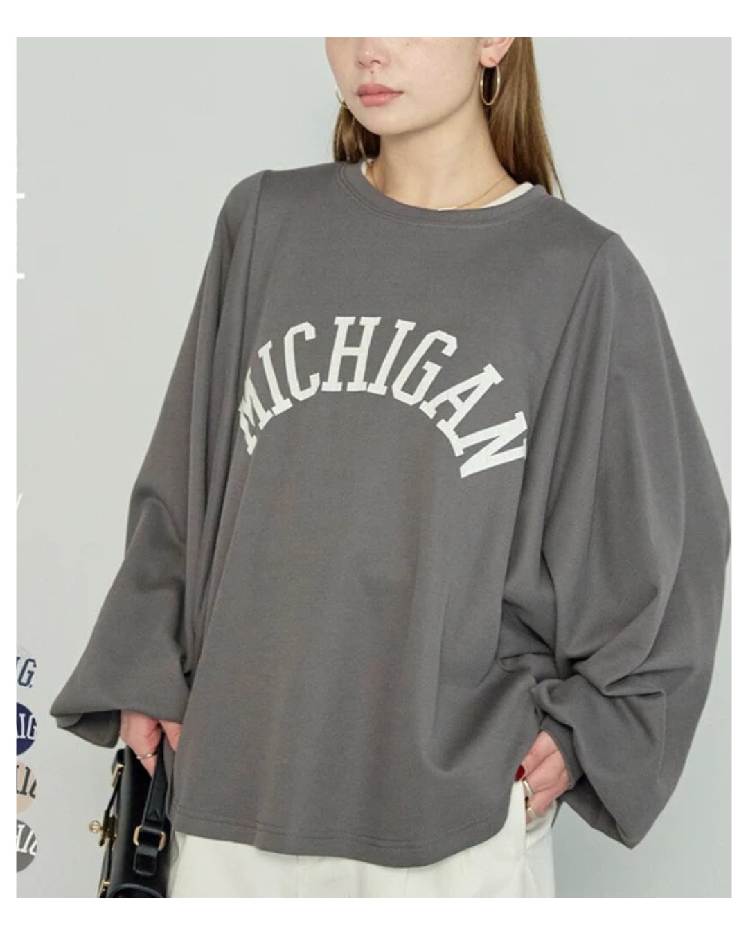 カレッジロゴT / ロゴTシャツ / ミシガンロゴ / ドルマンスリーブ / ボリューム袖 / 天竺編み / スウェット見え / 裾ダブル / ワイドシルエット / オーバーサイズ / ドロップショルダー / 綿ポリ / ストレッチ / きれいめカジュアル / 大人カジュアル / モードカジュアル / 体型カバー / 春Tシャツ / 夏Tシャツ / カレッジプリント