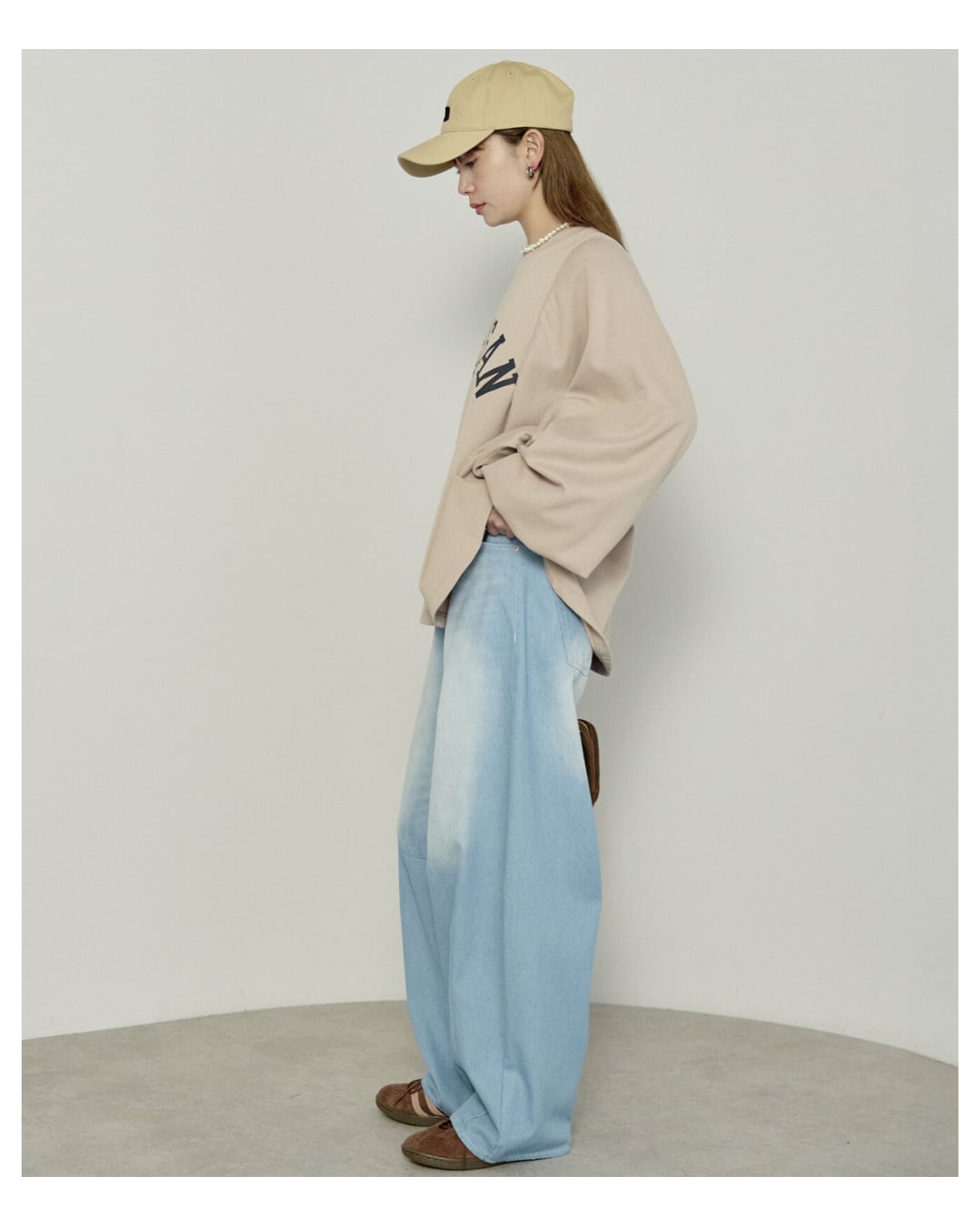 おすすめのスタイリングは、あえて落ち感のあるきれいめのワイドスラックスや、センタープレスの効いたトラウザーを合わせた、都会的なミックススタイルです。裾のダブル仕様を活かして、ボトムにフロントインすれば、腰回りに絶妙なニュアンスが生まれ、脚長効果も抜群。より女性らしく振るなら、艶やかなサテンスカートや、透け感のあるシアーボトムを合わせ、スポーティーさとエレガンスのコントラストを楽しむのが今の気分です。足元はボリュームスニーカーでストリートモードに、あるいは華奢なミュールで大人っぽく引き締めるなど、カレッジロゴの無骨さを自由な解釈で愉しめる、汎用性に優れた一着です。