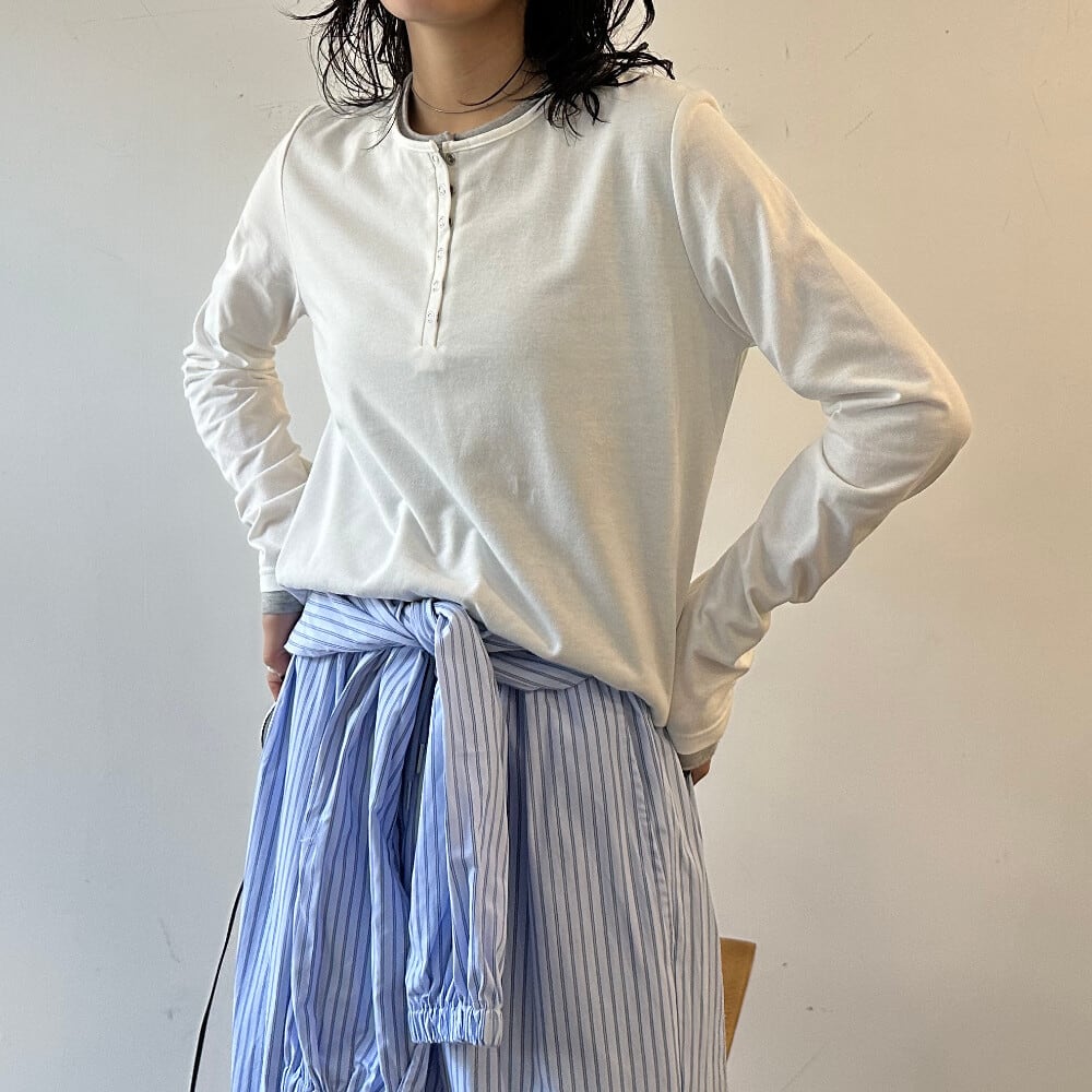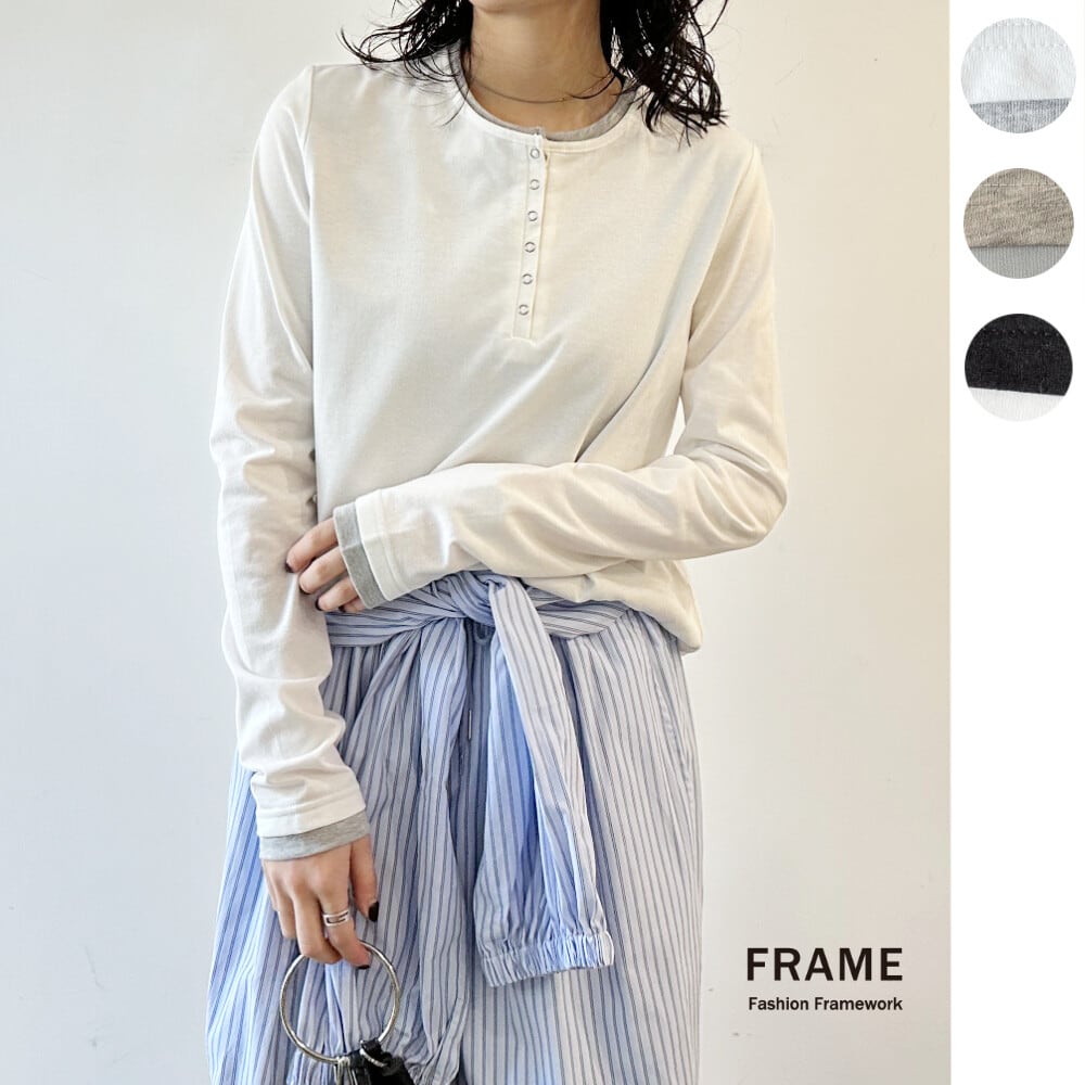 【design point】・しっかりしたカットソー素材を使用し、何にでも合わせやすいところがおすすめ・襟、袖口、裾にレイヤード風の配色デザインが人気のポイント・ここ数年の人気のヘンリーネックを使用し、抜け感のあるスタイリングをお楽しみいただけます。