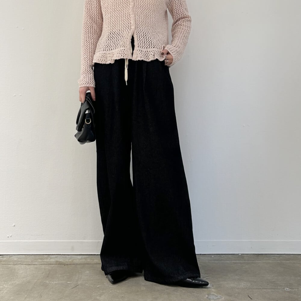 ウエストは紐付きで調節可能、ゆったりとしたルーズシルエットで体型カバーも叶えます。