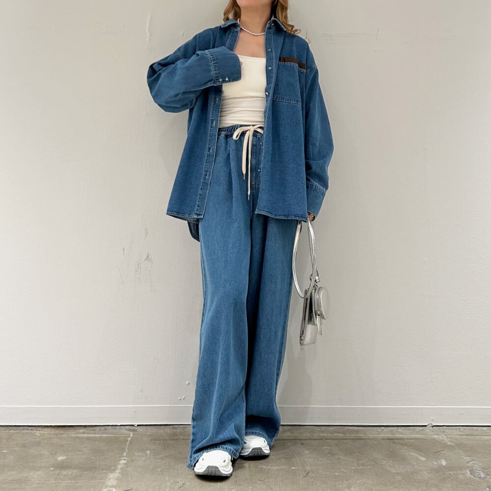 【スタイリング】1〜4枚目 ライトオンスデニムオーバーサイズシャツ5〜6枚目 ミックスメッシュVネックCD