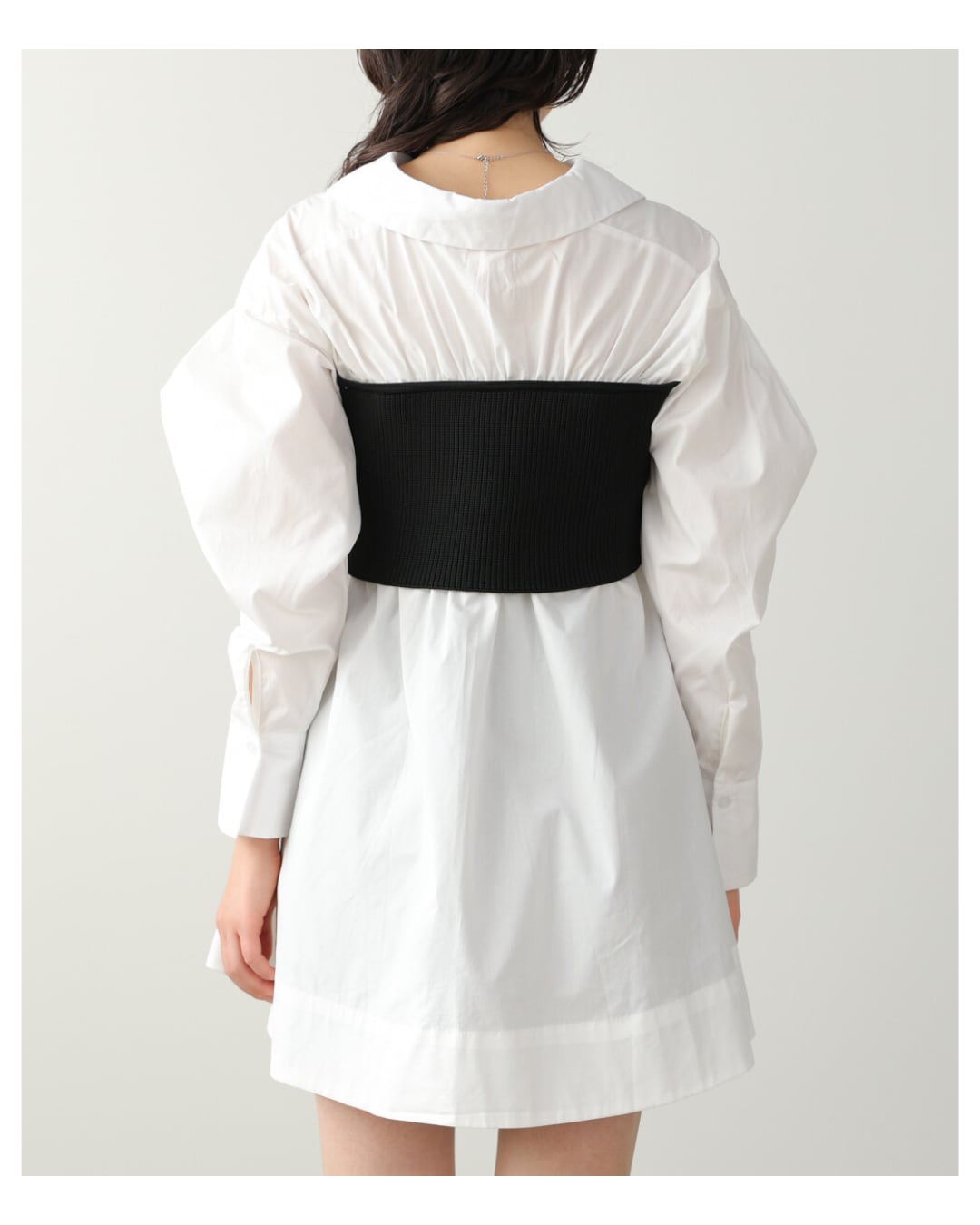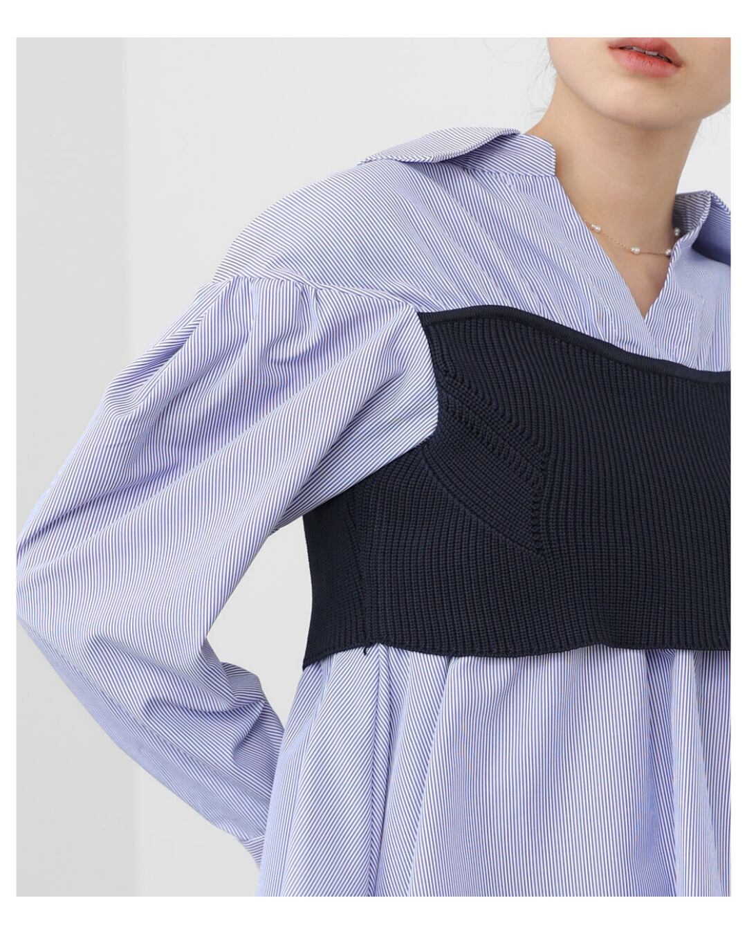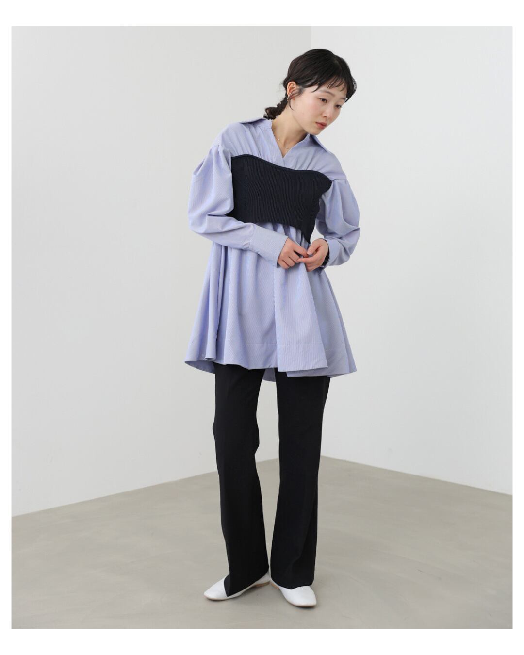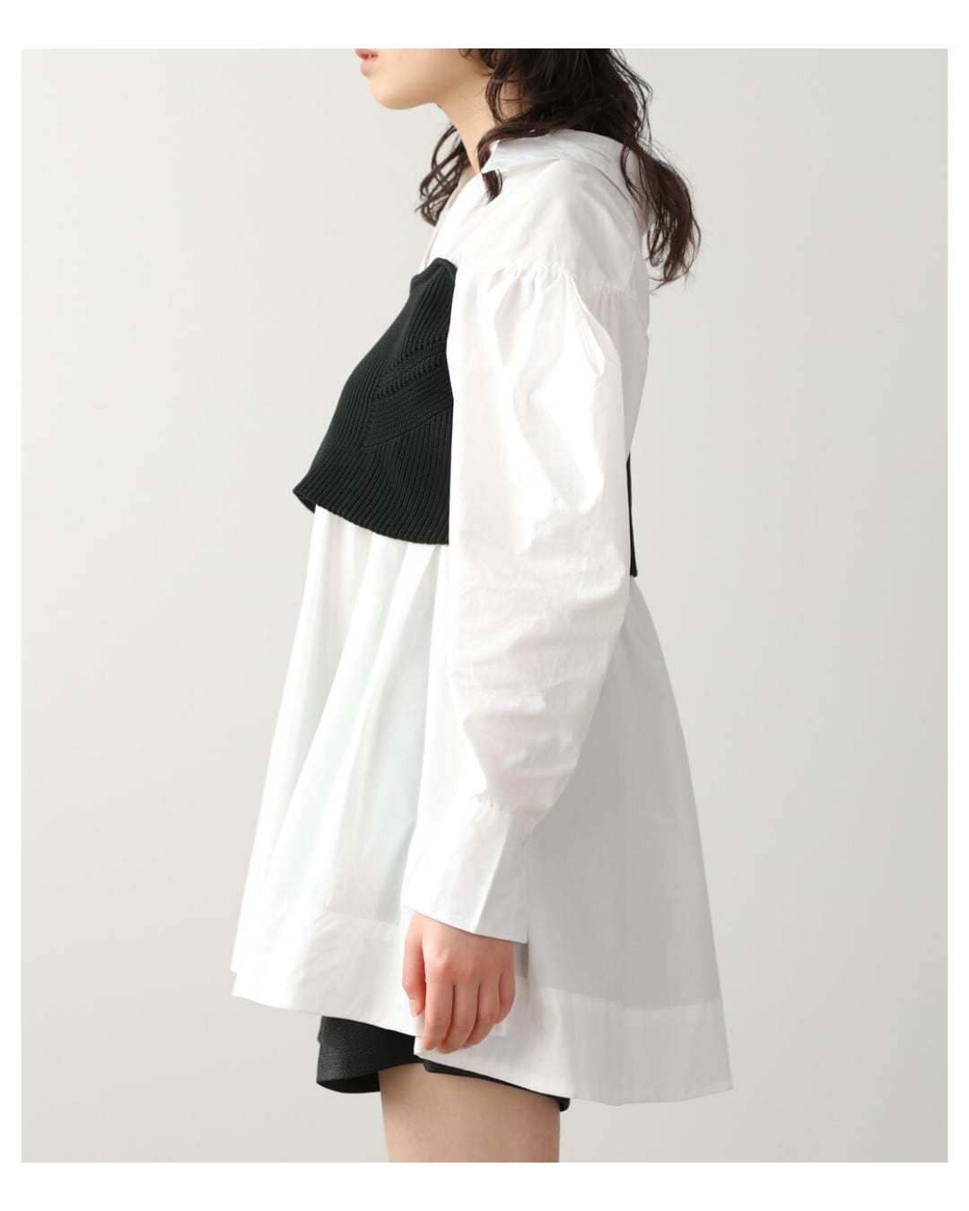 ■POINTトレンド感のあるビスチェをドッキングした、1枚で着映えが叶うブラウス。ふんわり広がるフレアシルエットに、コンパクトなニットビスチェを重ねたようなデザインで、自然とスタイルアップを演出します。ボリュームスリーブと切り替え位置のバランスが絶妙で、甘さとモード感を程よくミックスした一着です。